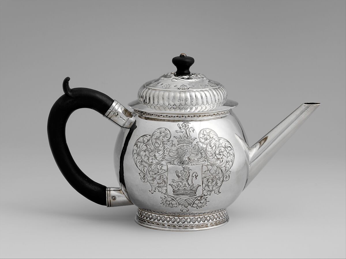 The globular body, straight spout, and detachable cover of this teapot imitate Chinese ceramics, while the luxurious armorial engraving, die-stamped foot band, and meander wire are characteristic of early New York silver. The striking contrast of plain surfaces with linear and sculptural ornament characterizes the finest work of this period. Engraved feather mantling surrounds the arms of the Philipse family, wealthy merchants of colonial New York. The teapot later passed into the Jay family.