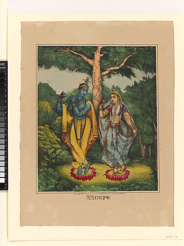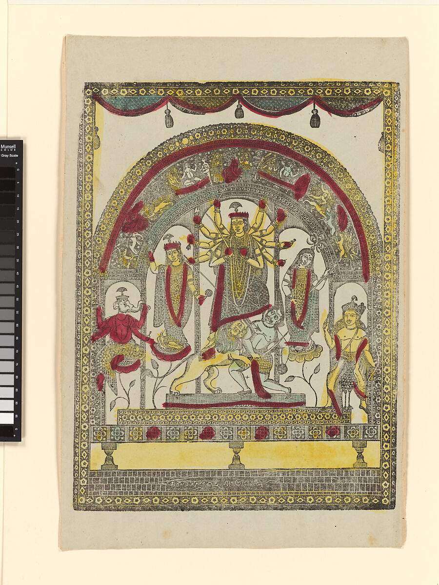 This early relief print celebrates regional religious practices in West Bengal, particularly those centered in the city of Kolkata. Here, the goddess Durga is enthroned in her portable pavilion (pandal), similar to those installed in temporary shrines during the city’s annual Durga Puja festival. The goddess, aided by her lion mount (vahana), slays the mighty demon Mahisha. Durga is flanked by her children, with Ganesha on her right and Kartikeya on her left. A curved frieze frames the figures and shows various mythological battle scenes and vignettes from the Ramayana epic. Concealed within the lower register, marked by brickwork patterning, is the artist’s name inscribed in a Bengal script