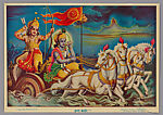 This print depicts a celebrated moment in the epic Mahabharata, when the hero Arjuna rides into battle at Kurukshetra with Krishna serving as his charioteer. Prior to combat, the two reflected on the many ethical dilemmas surrounding warfare. This conversation forms the basis of the Bhagavad Gita scripture. Resolved to do battle, Arjuna prepares an arrow while Krishna sounds his conch-shell war trumpet.