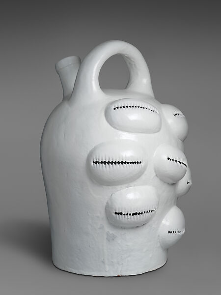 Informed by her ongoing exploration of Black female-identified subjectivity, Simone Leigh’s work is at the nexus of traditional pottery and contemporary sculpture. Large Jug is inspired by a nineteenth-century face jug in The Met’s collection made by an enslaved potter in Old Edgefield, South Carolina, a vessel that likely served both quotidian and ritualistic functions. More than five feet tall, Large Jug features bulbous embellishments in high relief, each with saw tooth perforations reminiscent of cowrie shells, a motif associated with Black culture throughout the African diaspora, and a reference to the Edgefield face vessels. The white glaze evokes the kaolin used in Congolese and Edgefield pottery traditions. This work was included in The Met’s groundbreaking 2022 exhibition Hear Me Now: The Black Potters of Old Edgefield, South Carolina, which placed the work of enslaved potters in the nineteenth-century American South in dialogue with contemporary artists.