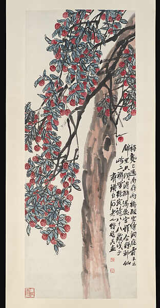 This work of art is currently on loan to the museum.Qi Baishi painted this imposing image of a lychee tree in full fruit when he was eighty-eight years old. Because of their copious fruits, lychees are considered symbols of abundance and fertility, making them suitable for expressing a wish for the birth of children. Qi borrowed the inscribed verses from a poem by the Tang dynasty poet Xu Yin (849–938).