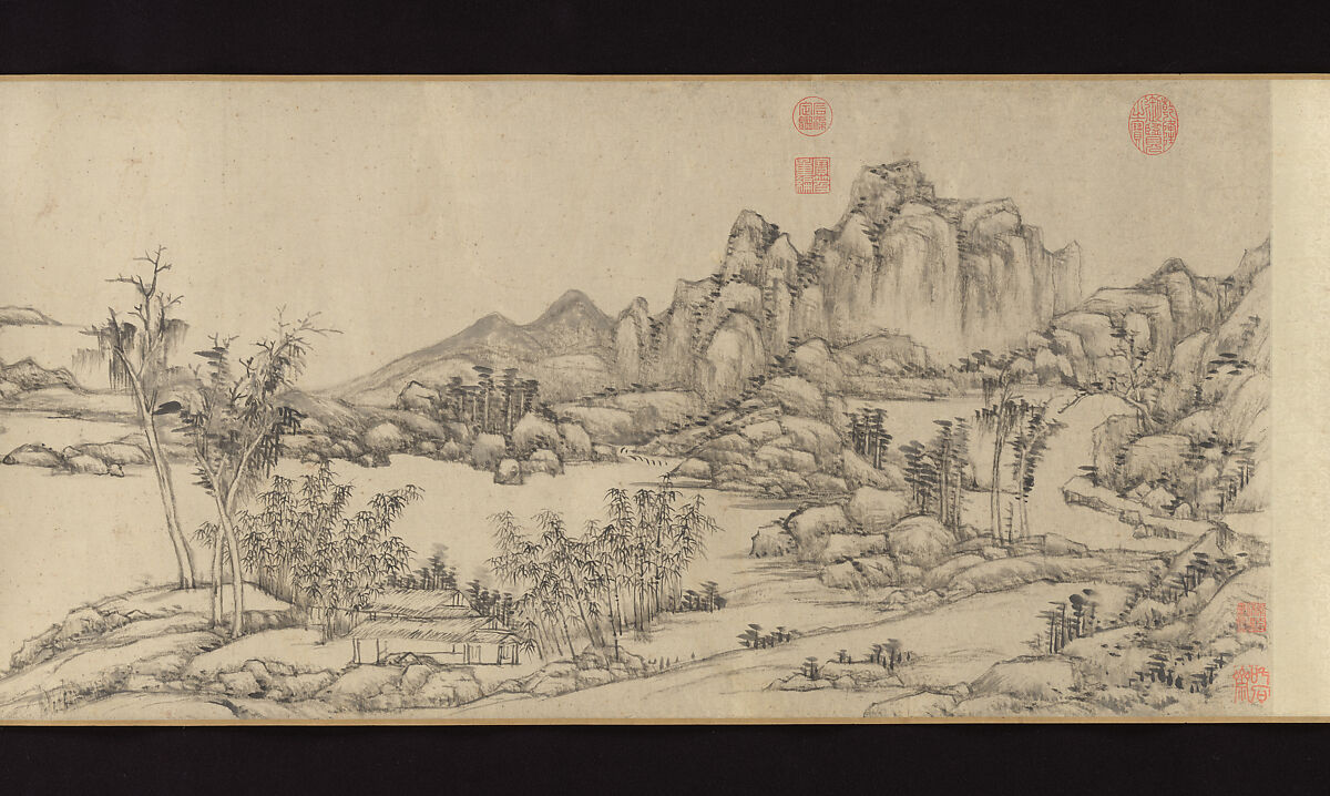 Streams and Mountains without End is the grandest surviving handscroll painting from the brush of Wang Yuanqi, one of the most celebrated painters of the Qing dynasty. Subtly varied ink tones describe a vast and constantly evolving riverscape, which unfurls across a handscroll more than seventy feet long. The painting shows many hallmarks of Wang’s typical approach to brushwork and composition—for instance, his layering of brushstrokes and confident interweaving of void and solid. A bold, experimental quality is also evident. Brash contour lines and dotting, along with some particularly daring compositional strategies, make this scroll unusual within the artist’s oeuvre.