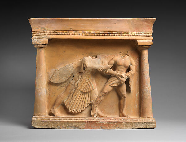 Eos, goddess of the dawn, pursues the youthful hunter Kephalos on the front of this arula (altar). Used for religious libations and food offerings, arulae have been found in sanctuaries, private houses, and tombs. Mythological scenes on arulae from Selinus often correspond with temple decorations at the site. This example from the Sanctuary of Demeter Malophoros recalls the encounter between Eos and Kephalos on the metope nearby that once adorned a temple on the Acropolis.