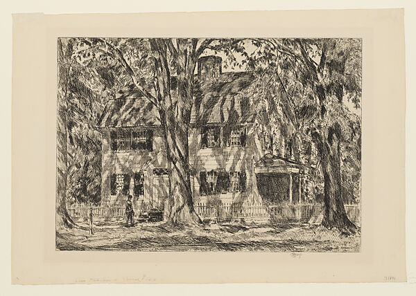 The celebrated American Impressionist Childe Hassam made his first etchings in 1898 but only began to focus seriously on the medium in 1915. The artist bought a property in East Hampton in 1919 and then explored local subjects in his art, among them the historic house seen here. Working in monochrome encouraged a new emphasis on surface patterning and Hassam weaves strking visual effects from shadows, leaves and branches, demonstrating a new expressionism The Lion Gardiner House, shielded by a picket fence and ancient trees, had been built in 1835 and named after a seventeenth-century English settler and major property owner in the area. When Hassam depicted it, the building belonged to a descendant, David Gardiner. In the major hurricane of 1938 it would be severely damaged and then replaced by a Renaissance style stone mansion.