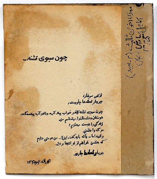 This work is among the earliest works by the internationally acclaimed artist, Siah Armajani who passed away in 2020. They are simple but telling expressions of a young political activist and nationalist who was disillusioned with the turn of events following the 1953 coup that toppled the government of Mohammad Mossadeq. The page has been removed from an anthology of the modern Iranian poet and activist, Mehdi Akhavan Saless. Saless's poem "Chu Sabu-ye Teshneh" (The Parched Pitcher) spoke to Armajani with such intensity that he wrote over the verses and signed his own name next to them. It is an intimate expression of a young artist grappling with disillusionment about his future and the future of his country.