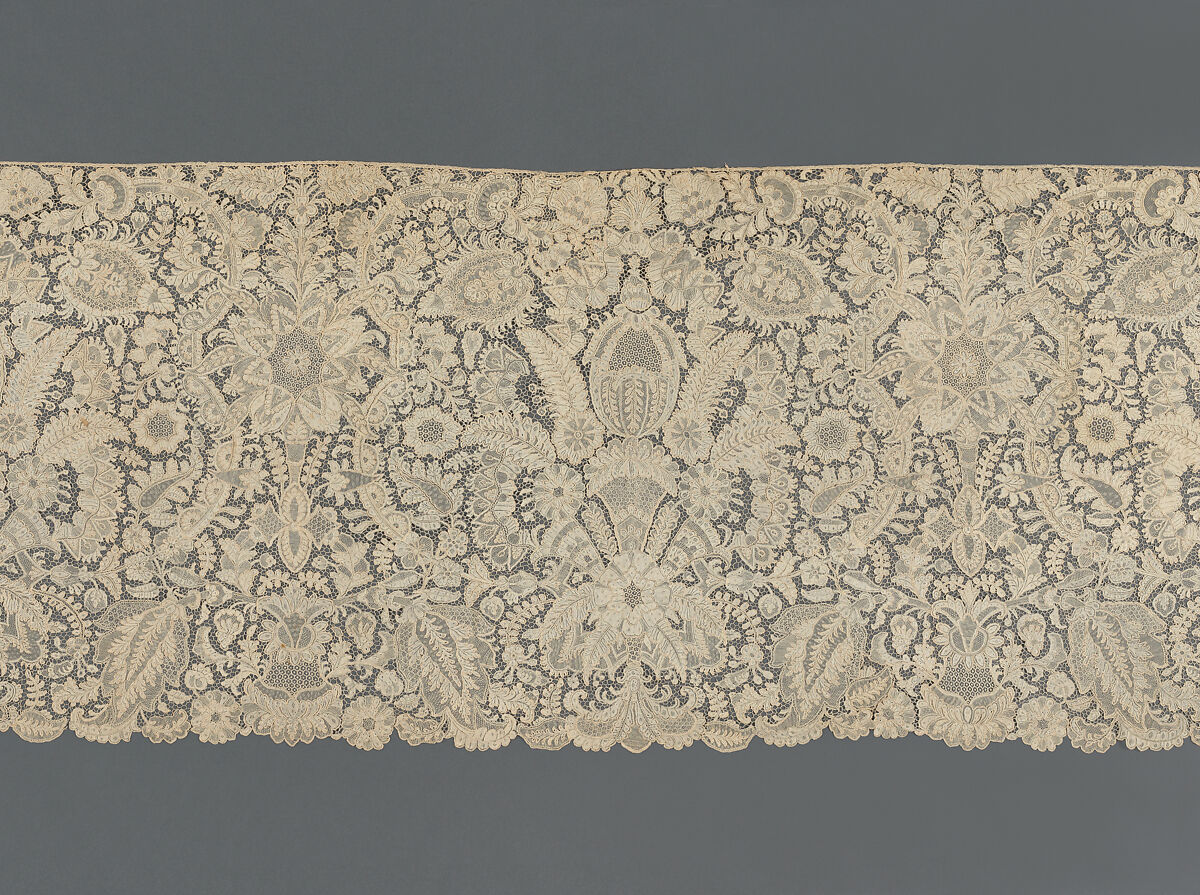 With incredible dexterity, in the technique evocatively named in French Point de France (“French stitch”), threads are looped together in increasingly complicated patterns within a hexagonal background mesh, resulting in the light, open and gauzy effect. The new and modern field of lace-making, only developed in Europe in the fifteenth century, was dominated by women, most of whom were professionals. Designs, on the other hand, tended to be reproduced from printed pattern books, also used for woven silks and velvets of the period. Here, foliate scrolls and curlicues border a repeat pattern of open blooms and pomegranates. Given its length and broad format, this was almost certainly created as a flounce intended to be applied around the edges or front border of a fine linen textile for use as a furnishing cloth within a luxurious (and probably domestic) space.