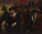 According to a 1922 account, the painting derived from months of study of various individuals standing in line for performances at New York’s Metropolitan Opera House. Established as an alternative to the old-moneyed and discriminatory Academy of Music, the Opera House drew a more diverse cross-section of New Yorkers. The painting includes a portrait of the artist’s mother, Anne Bernstein, who faces forward in elegant black-and-white attire, holding an umbrella and program. Music Lovers was acclaimed on its debut in the National Academy annual as "stunning," with other critics noting that Bernstein was a young artist to watch.