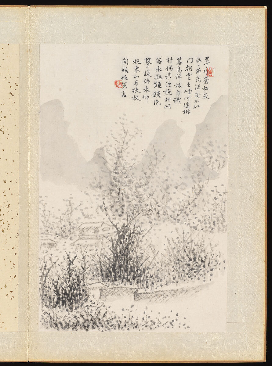 Huang Xiangjian is known as “Huang the Filial Son” (Huang xiaozi 黃孝子) for a famous multiyear journey he undertook to find his parents following the fall of the Ming dynasty. After his successful rescue mission, he solidified his reputation by making dramatic paintings of the forbidding landscapes he had traversed. This rare album shows a different side of the artist. Unlike the forceful brushwork of his “filial son” paintings, in these images Huang employed layers of subtly varied ink tones and controlled contrasts of wet and dry brushwork. The album reveals him to be a knowledgeable practitioner of a wide range of styles, something not evident in his other work.