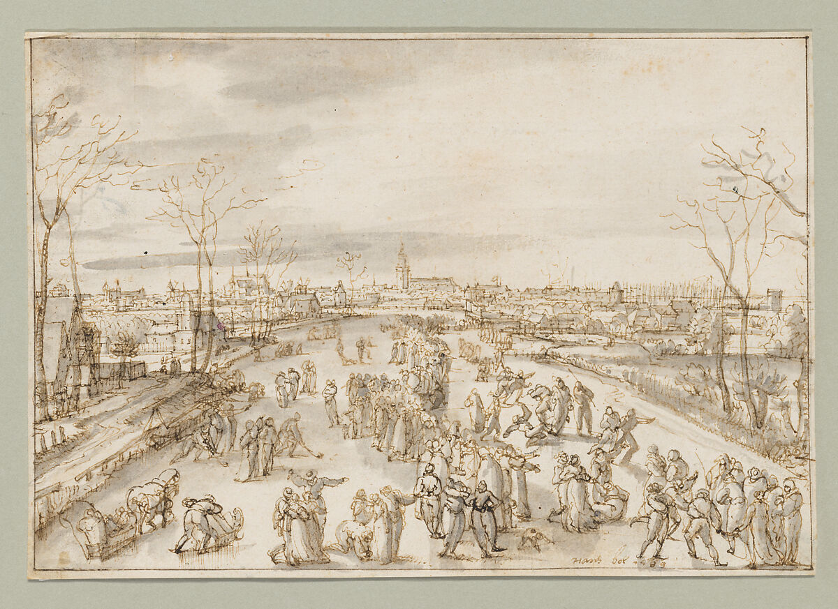 Across the icy surface of a frozen river, figures congregate, enjoy sleigh rides and kolf (an early form of golf, played on the ice), and wipe out in spectacular fashion. On either side of this lively scene stand buildings and wiry, leafless trees, and in the distance rises the city of Amsterdam. This recently discovered drawing is a new addition to the oeuvre of Hans Bol, one of the first artists of his generation to flee religious persecution in the Southern Netherlands and relocate to the North. Settling permanently in Amsterdam in 1586, Bol played an enormously important role in the development of naturalistic landscape in Holland, introducing to its burgeoning art market landscapes grounded in direct observation, emphatically local terrain, and quotidien motifs--the qualities that would set the course of Dutch landscape practice for years to come.