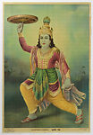This image depicts the legend of Krishna stealing clothing from milkmaids (gopis) while they bathe in the Yamuna River. The god sits in a tall tree, having hung the women’s saris on branches beyond their reach. Some of the gopis implore him to return the garments to restore their modesty. This is a favorite subject for artists depicting the adolescent pranks of Krishna’s youth as it foretells the passionate devotionalism (bhakti) celebrated through Krishna’s romance with Radha (herself a gopi). The artist, Hira Lal Karmaka, introduced a level of photographic realism, that renders the women as almost recognizable individuals. This makes their nudity somewhat shocking in a devotional lithograph. Pointedly, the unusual title given to this subject, Vastraharana, comes from the Marathi phrase “to disrobe.”