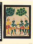 A scene from a later version of the Uttar Kanda chapter of the Ramayana rather than from Valmiki’s classic version, depicting Rama and Lakshmana confronting the twin brothers Luv and Kush, whose identity as his son’s born of Sita, is not yet known to Rama. They twin boys have tethered the white horse, seen center, which Rama has instructed roam free across his kingdom, so triggering a conflict with Rama’s armies. Inscribed in Bengali and English