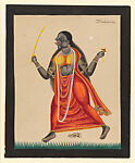 Tara Thakoorani stands astride her consort, Shiva, as he lies on a tiger-skin rug and gazes up from his mountain abode, which is ablaze with energy. The youthful goddess is of dark-blue complexion and is framed, mandala-like, by her long black hair and radiant halo. She wields a sword and holds a severed head; a crow drinks the dripping blood. The painting is from a set depicting Hindu deities, scenes from epics, heroes, holy men, and demons that was typically sold to pilgrims at the Kali temple in Kolkata. The choice of subject matter assumes a sound knowledge of Hindu mythology and epic literature, suggesting that these prints were intended for an educated audience.