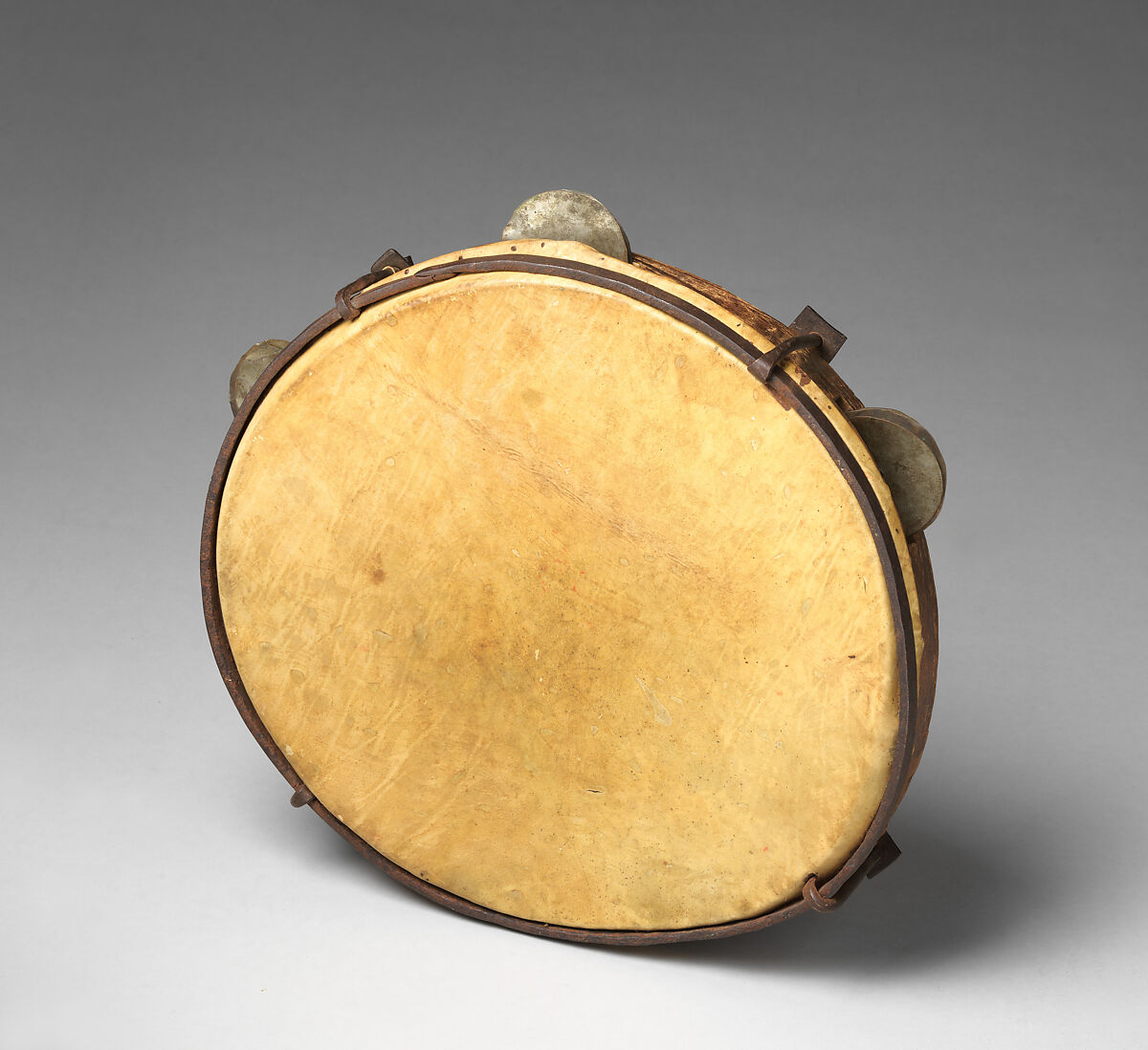 This roughly hewn, homemade tambourine dates to the middle of the nineteenth century. It has three sets of three tin disks that would rattle when the skin was hit. Unusually, the maker of the tambourine included a wooden handle to hold the instrument with one hand while hitting it with the other.