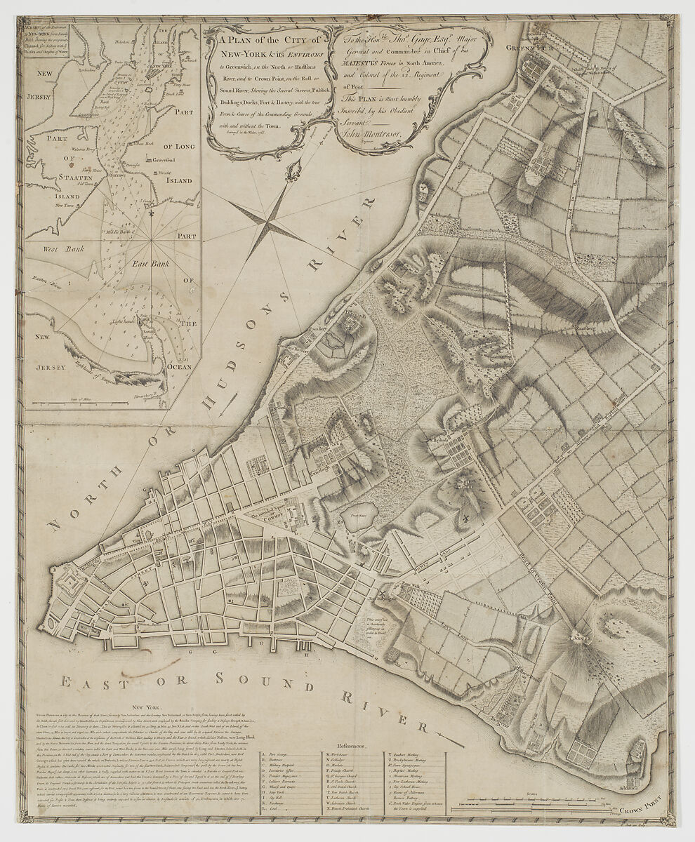 A Plan of the City of New-York & its Environs, to Greenwich, on the North, or Hudsons River, and to Crown Point on the East, or Sound River, Shewing the Several Street, Publick Buildings, Docks, Fort, & Battery, with the true Form & Course of the Commanding Grounds with and without the Town, Survey'd in Winter 1766-66 [The Montresor Plan]