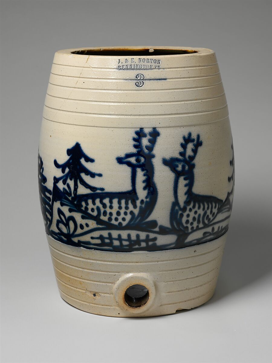 During the 1850s, Julius and Edward Norton, like their upstate New York competitors, produced stoneware with designs in cobalt blue slip. Typical of the motifs found on their wares are birds, flowers, stags, dogs, and eagles, executed with little regard to relative scale.