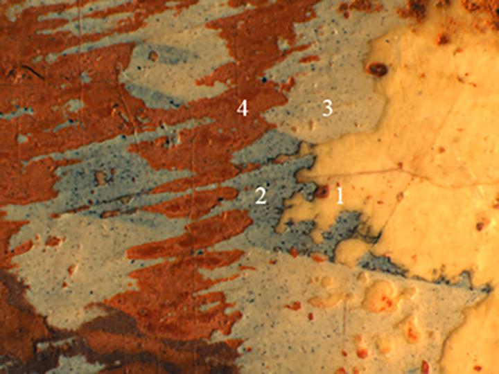 Fig. 8. Photomicrograph showing: 1) the ground; 2) the underdrawing; 3) the gray-white priming layer; 4) the red paint from Joseph's robe