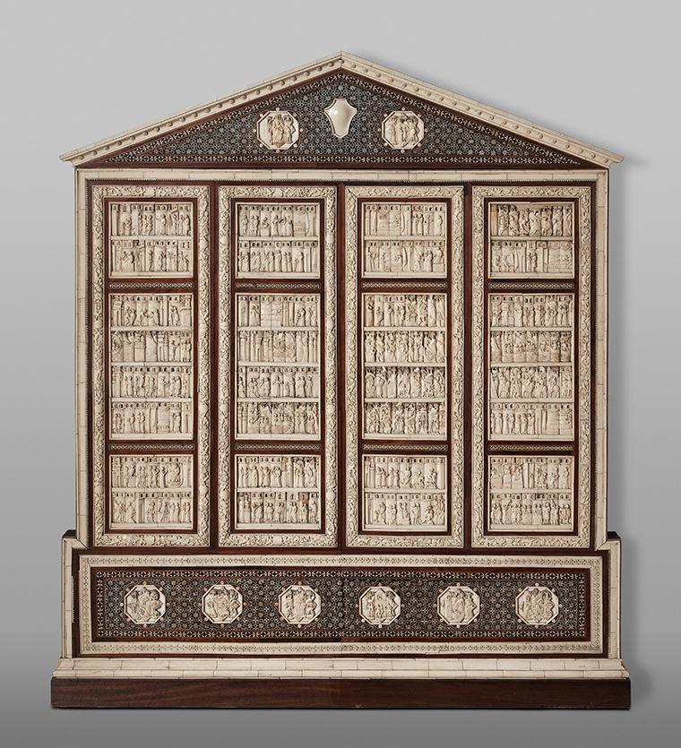 Medieval artworks often survive as fragments, in heavily restored states, or as elements in modern assemblages. As such, art historians are often called upon to explain why medieval artworks look as they do at present, deduce which parts are in fact medieval, and to characterize the scope of changes made by modern restorers and re-users. Met Museum 17.190.490a, b a cabinet frontal covered in early fourteenth-century Embriachi carving, presents many of the questions that we hope to resolve in this type of research. “Embriachi carving” refers to opulent jewelry boxes and altarpieces composed of carved bone panels depicting narrative scenes trimmed with dazzling marquetry in colored woods and stained bone. The style gains its name from a receipt dated to 1409 that claims that the monks of the Certosa (or Carthusian monastery) of Pavia still owed the Florentine merchant Baldassre degli Ubriachi part of the astronomical sum of 1000 florins for two boxes covered in bone carvings and for a similarly adorned altarpiece for their chapel. While the current object, a cabinet frontal with a plinth and pediment, does not much resemble that description, we know from the object’s provenance (that is to say its life history), that it is composed of fragments of these boxes. Working backwards from the present, we can use documentary records to verify that the carvings left the Certosa de Pavia upon its secularization in 1782 and passed into the collection of its former abbot, Benedetto Torodorò. They later belonged to Caetano Cattaneo, Director of the Mint of Milan, then to the famous collector Giovanni Battista Cagnola, and then to J. Pierpont Morgan in 1912, from whom The Met received them as a gift in 1917.