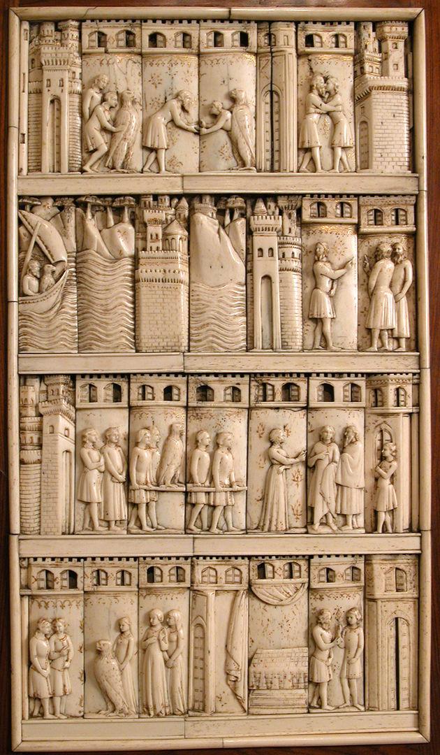 (fig 1: Cabinet frontal with panels from two Embriachi caskets, Baldassare degli Embriachi (Italian, active 1390–1409), ca. 1400–1409, made in Florence, Italy, bone and Certosina (inlays of stained woods, bone and horn) with traces of gilding, 81 3/4 × 70 7/8 × 3 3/8 in. (207.7 × 180 × 8.5 cm), Gift of J. Pierpont Morgan, 1917 (17.190.490a, b)