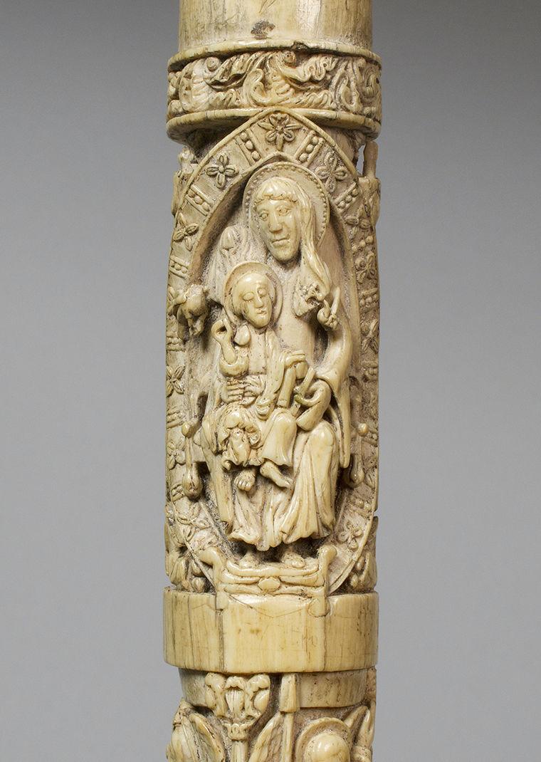 The uncarved frame intersecting with both mandorlas is intriguing because of its simplicity with respect to the shaft segment’s otherwise dense figural or ornamental carving (see, for example, the topmost border). While it is possible that a metal ring could have covered the plain border, and therefore hid the carver’s incised “sketches” from view, the craftsperson might have intended to fill the area with low relief carving to match the rest of the shaft segment. To the right of the Virgin’s unfinished footstool, for example, two circles are also pricked into the surface of the ivory: one large and one small (at right).