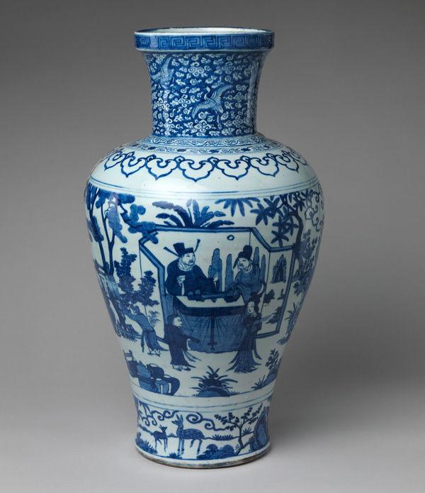 This vase featuring a romanticized scene of a poet in nature would have captivated European patrons with its depiction of far-off places and use of unfamiliar imagery. Jar with poet Zhou Dunyi, dated 1587. Ming dynasty (1368–1644), Wanli mark and period (1573–1620). China. Porcelain painted with cobalt blue under transparent glaze (Jingdezhen ware); H. 23 3/4 in. (60.3 cm); Diam. 12 7/8 in. (32.7 cm); Diam. of rim 7 5/8 in. (19.4 cm); Diam. of base 7 7/8 in. (20 cm). The Metropolitan Museum of Art, New York, Rogers Fund, 1920 (20.41.2)