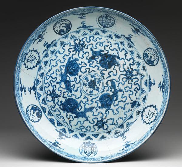 This plate was designed specifically for the Portuguese court, as evidenced by the Portuguese coat of arms in the bottom-center roundel. Dish with IHS monogram, armillary sphere, and Portuguese royal arms, ca. 1520–40. Chinese. Hard-paste porcelain with underglaze cobalt blue decoration (Jingdezhen ware); H. 3 3/4 in. (9.5 cm.); Gr. diam. 20 3/4 in. (52.7 cm.). The Metropolitan Museum of Art, New York, Helena Woolworth McCann Collection, Purchase, Winfield Foundation Gift, 1967 (67.4)
