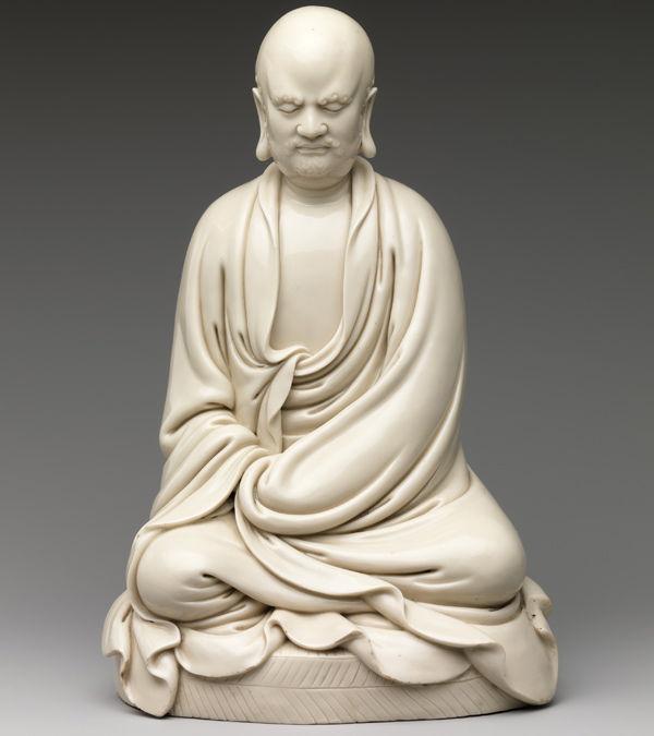 This object was probably used devotionally. Representations of this and other Buddhist figures were sometimes copied or reinterpreted by Western artists working at factories such as Meissen in Germany. The copying was inspired largely by an appreciation for the quality of the porcelain and the beauty of the glaze. The religious aspect of the imagery was ignored and misunderstood. Chan patriarch Bodhidharma, 17th century. Ming dynasty (1368–1644). China. Porcelain with ivory glaze (Fujian Province; Dehua ware); H. 11 3/4 in. (29.8 cm); W. 7 1/2 (19 cm); D. 5 1/2 in. (14 cm). The Metropolitan Museum of Art, New York, Gift of Mrs. Winthrop W. Aldrich, Mrs. Arnold Whitridge, and Mrs. Sheldon Whitehouse, 1963 (63.176)