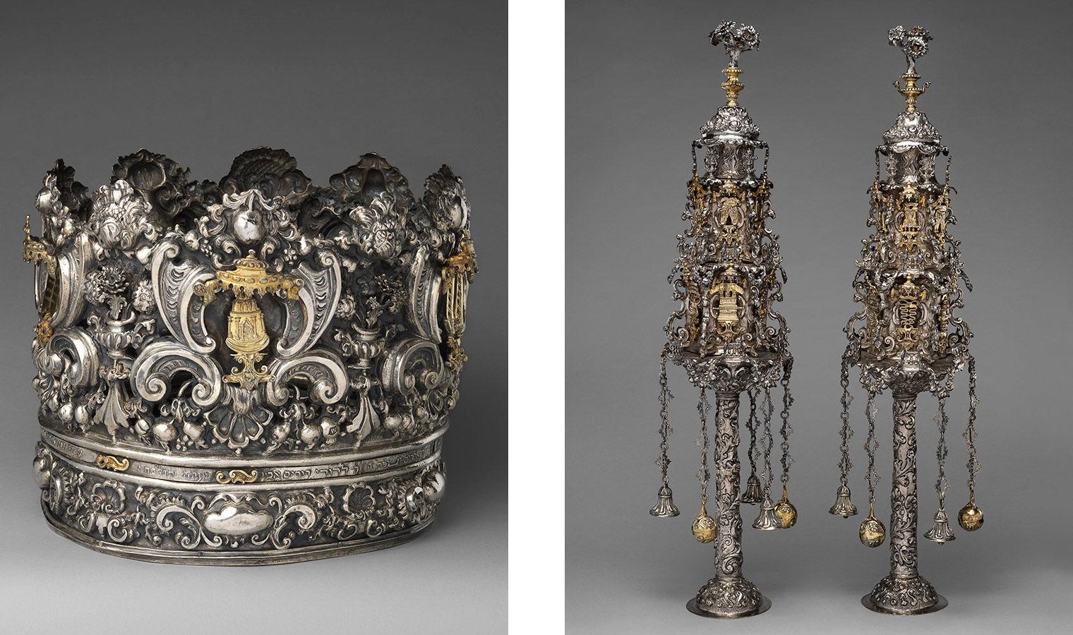 Left: Andrea Zambelli "L'Honnesta" (Italian, active 1732–1772). Torah crown (keter), ca. 1740–50. Italian, Venice. Silver, parcel gilt, 10 3/4 x 12 3/8 x 12 3/8 in. (27.5 x 31.4 x 31.4 cm). The Metropolitan Museum of Art, New York, Purchase, Director's Fund, 2013 (2013.443). Right: Andrea Zambelli "L'Honnesta" (Italian, active 1732–1772). Pair of Torah finials (rimonim), ca. 1740–50. Italian, Venice. Parcel-gilt silver, both 26 5/8 x 6 1/4 x 6 in. (67.5 x 15.7 x 15.2 cm). The Metropolitan Museum of Art, New York, Purchase, Walter and Leonore Annenberg Acquisitions Endowment Fund, 2016 (2016.416, .417)
