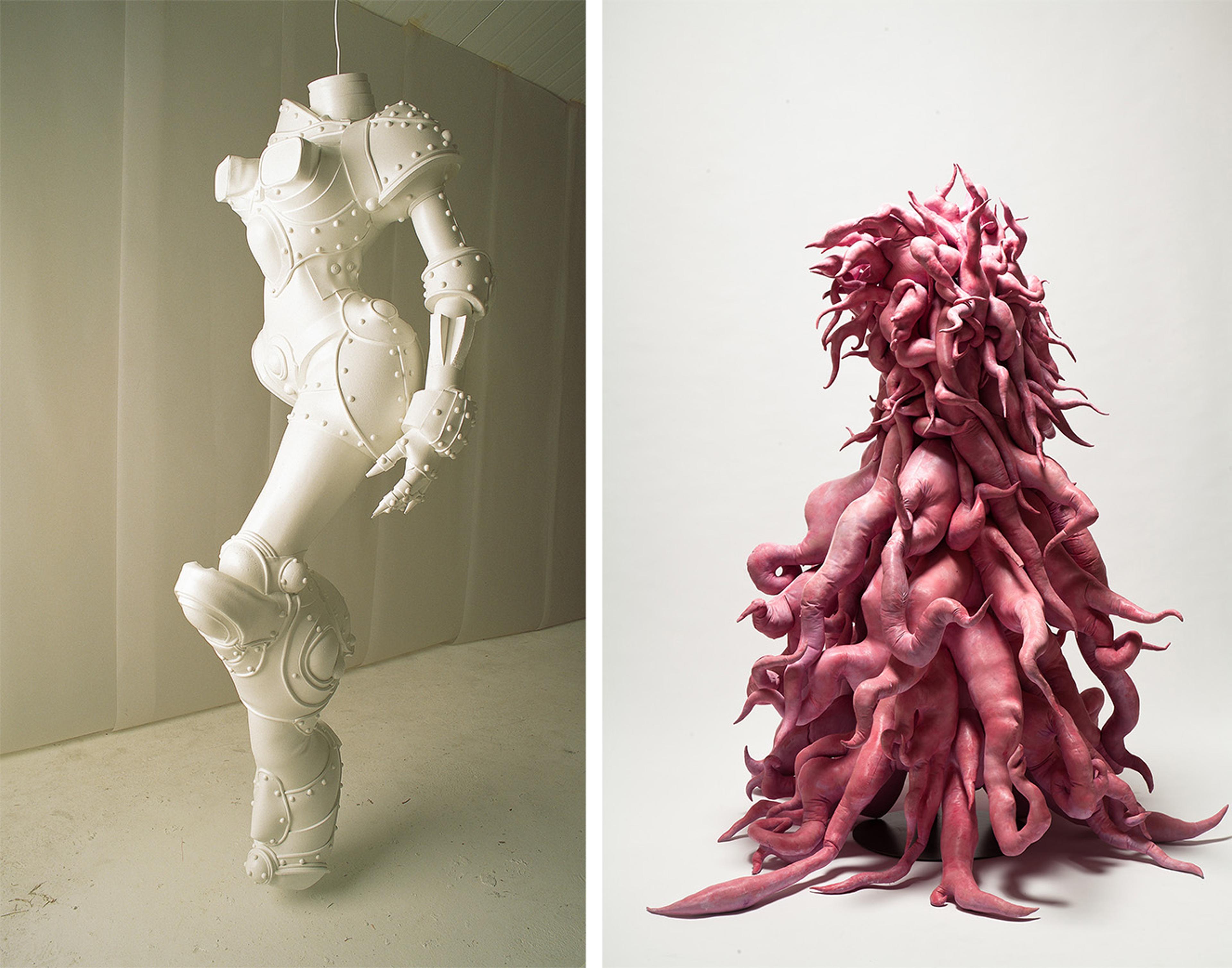 Left: Lee Bul (South Korean, b. 1964). Cyborg W1, 1998. Cast silicone, polyurethane filling, paint pigment, 185 x 56 x 58 cm. © Lee Bul. Photo: Yoon Hyung-moon. Courtesy of the artist. Right: Lee Bul (South Korean, b. 1964). Monster: Pink, 2011 (reconstruction of 1998 work). Fabric, fiberfill, stainless-steel frame, acrylic paint, 210 x 210 x 180 cm. © Lee Bul. Photo: Jeon Byung-cheol. Courtesy of the artist