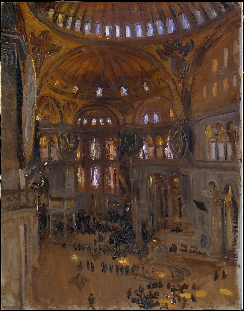 This oil sketch was probably painted in 1891 when Sargent was studying Byzantine mosaics in preparation for his murals for the Boston Public Library. This is one of two located studies of the interior of Hagia (Santa) Sophia in Constantinople (the other study is in the J. B. Speed Art Museum, Lexington, Kentucky). The church, a monument of Byzantine art, was built between 532 and 537, during the reign of the Emperor Justinian I, and fell into Turkish hands in 1453, subsequently becoming a mosque.