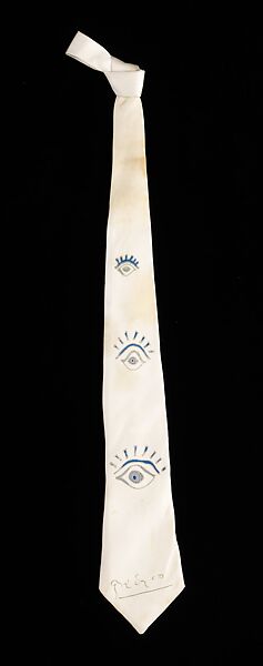Pablo Picasso is one of the most recognizable artists of the 20th century. He was adept at producing thought-provoking works of art in an unstable time. Picasso's art on this tie is likely the product of a rare custom design created in a hand printing process. It is unique, complete with Picasso's printed signature, furthering its status as wearable art.