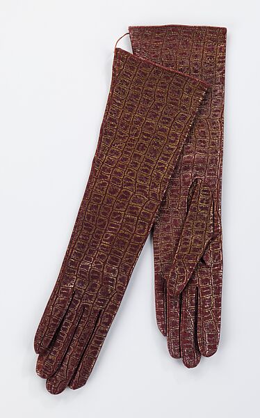 Yves Saint Laurent's final collection for Dior in 1960 embodied the feeling of Rive Gauche, or the Left Bank of Paris. Although it was not a success, the collection marked a turning point in Saint Laurent's career and details from that collection returned again and again as signature elements in Saint Laurent's own couture line and in his ready-to-wear collections. One such detail was the use of crocodile and alligator skins or printed textile versions. These gloves from Rive Gauche are a refined and luxe replication of an alligator skin. In a lesser example, the pattern might be embossed on inexpensive leather, but here it is printed with gold pigment, making the gloves an example of tromp l'oeil textile design was well as a high style accessory.