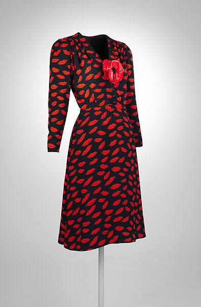 Yves Saint Laurent’s scandalous 1971 “Libération” collection featured signature elements of 1940s fashion—square shoulders, platform shoes, short fox jackets, and strong makeup. The collection was provocative for its advancement of a seductive femininity and for its appropriation of styles worn during wartime and occupation, which some critics read as nostalgia for a time of deprivation. The retro styles reflected fashions already worn by trendsetting young women in London, New York, and Paris, and foreshadowed the irreverent, ironic form of historicism that informed avant-garde fashion in the late twentieth century. This dress, with a print of bright red lips against a black ground, belongs to the ready-to-wear interpretation of the collection, which proved less controversial.