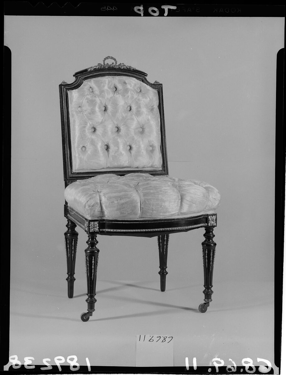 This side chair is part of a suite of Louis XVI–style furniture that John Taylor Johnston (1820–1893) purchased from the firm of Ringuet-Leprince and L. Marcotte in about 1856. This international firm had showrooms in both Paris and New York, and it is believed that at least some of the pieces of the suite were made in Paris for the New York commission. Johnston, a railroad executive and the first president of The Metropolitan Museum of Art, used the furniture in the music room of his residence at 8 Fifth Avenue. The suite (68.69.1–68.69.11, 68.165.1–68.165.6) includes two sofas, two armchairs, a table, two matching cabinets, a third large cabinet, six matching side chairs, a pair of lyre-back side chairs, and a firescreen. After Ringuet-Leprince retired in 1860, the firm became known as L. Marcotte and Company. Léon Marcotte was New York's most noted cabinetmaker and interior decorator during the 1860s.
