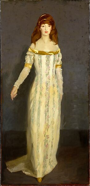 Henri's work was imbued with social awareness, and The Eight were, in general, especially attuned to the economic plight of urbanized society, with its influx of newly arrived immigrants struggling to survive. Although he painted a few street scenes and landscapes, it was in the closely observed, penetrating portraits of individuals that Henri excelled. One of his favorite models was his wife, whom he painted in the work shown here. Mrs. Henri, who posed for her husband often, was herself an artist, known for her graphic work and watercolors, which she exhibited under her maiden name, Marjorie Organ. The portrait demonstrates Henri's typical directness of presentation. His wife stands with one foot forward, one arm slightly extended, looking out of the canvas as if she were about to curtsy to the viewer. The elegance of her figure is emphasized by the verticality of the composition. There is nothing to look at but the subject, no interest in the background except as it serves to throw the figure into relief. Thanks to Henri's mastery of shorthand indications, the texture of the paint that represents the dress exactly simulates the material.