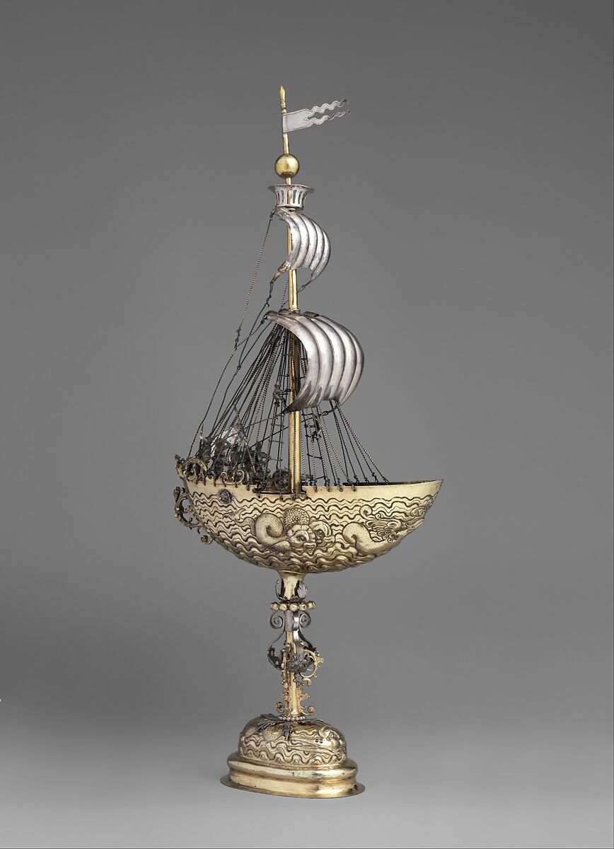 Called nefs in Old French, ceremonial centerpieces in the form of ships were developed in medieval France to mark a lord’s place at the table. In the German-speaking areas of continental Europe, variations doubling as drinking vessels (known as Schiffspokale) experienced a revival in popularity in the early seventeenth century. They were often used as wedding gifts to symbolize the couple’s safe journey through life. Zur Linden joined the Nuremberg goldsmiths’ guild as a master in 1609 and was the leading maker of inventive nefs like this one with its wondrous, embossed sea creatures amid the waves.