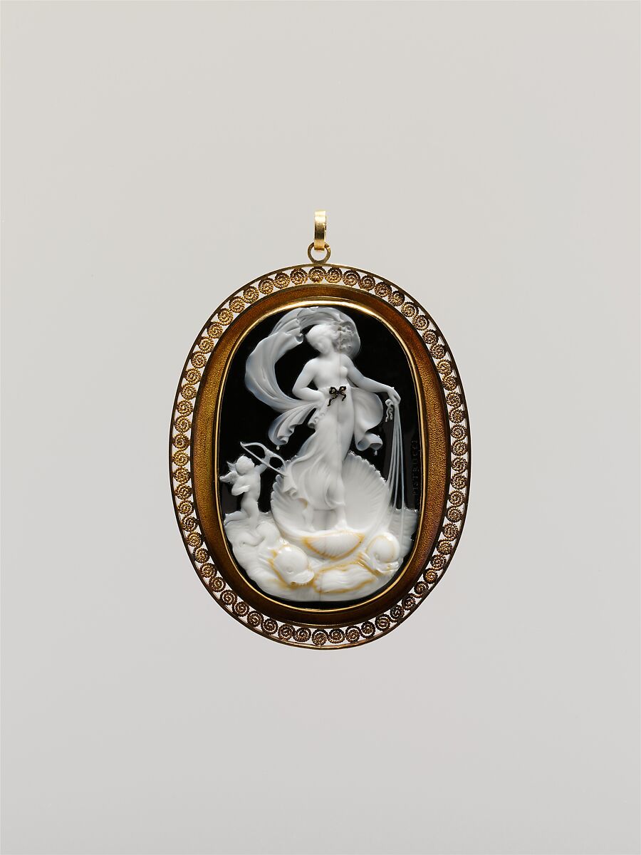 Amazingly, the relief’s surface is concave. Benedetto Pistrucci used his drill in a virtuoso excavation of the strata, employing the palest brown to outline the goddess’s shell and team of dolphins, shaping an exquisite bowknot from the foremost brown, and piercing the white layer perilously close to the black ground to define the sail-like drapery and dainty silken reins. The frame of about 1820–30 was later fleshed out with filigree.
