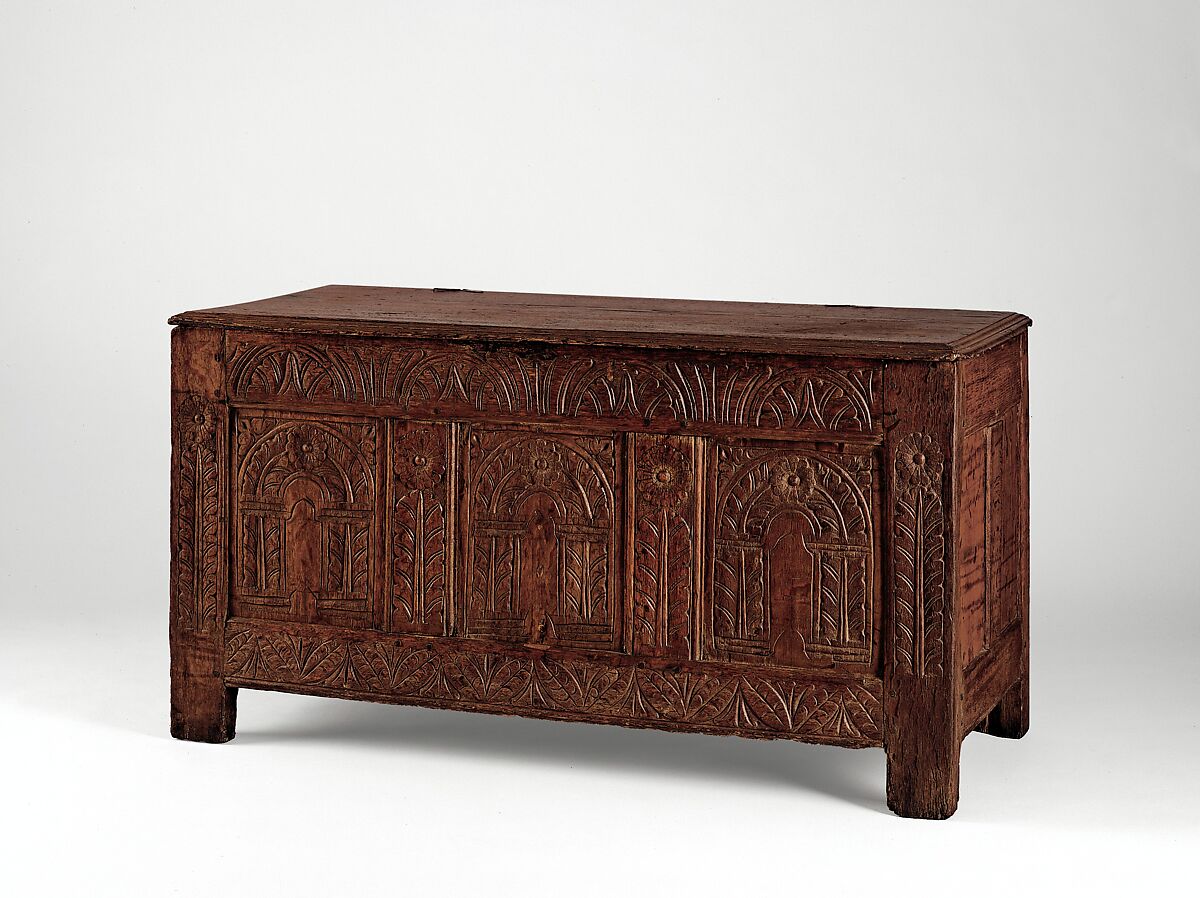 The carving on this chest with its motifs of arches, stylized leaves surmounted by rosettes, and particular types of leaves in pairs and in lunettes is typical of the work done by the earliest New Haven joiners. It is similar to another chest in the collection, 47.133.3.