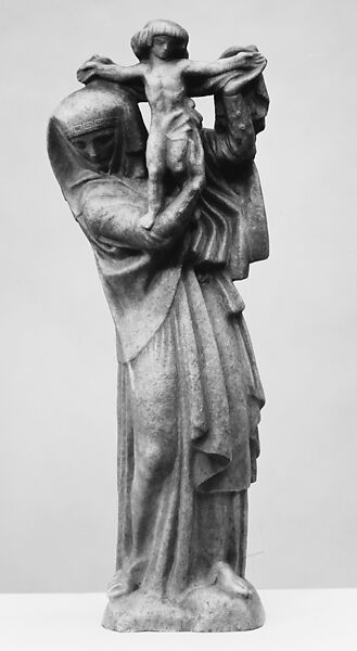 Bourdelle drew upon the artistic legacy of the Middle Ages in this sculpture, one of several carved stone replicas based on the second version of his model for the colossal monument erected at Niederbrück, Alsace. Versions also exist in bronze, cement (proof), plaster and marble. The monument was commissioned to fulfill the wishes of Madame Vogt, industrialist of Niederbrück, who vowed in 1914 to erect a statue to the Virgin if her property were spared. In 1919 Vogt's son awarded the commission to Bourdelle; the monument was erected in 1923.