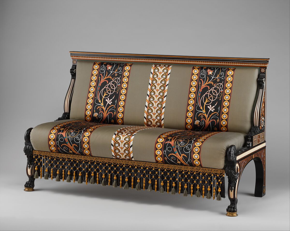 Part of a set of furniture designed for the music room in the New York residence of Henry G. Marquand on Madison Avenue at Sixty-eighth Street. Marquand was one of the founders of the Metropolitan Museum and its president from 1890 until 1902. The upholstery is modern: silkscreened designs were specially commissioned in an attempt to evoke the original richly embroidered panels of the settee's seat and back.