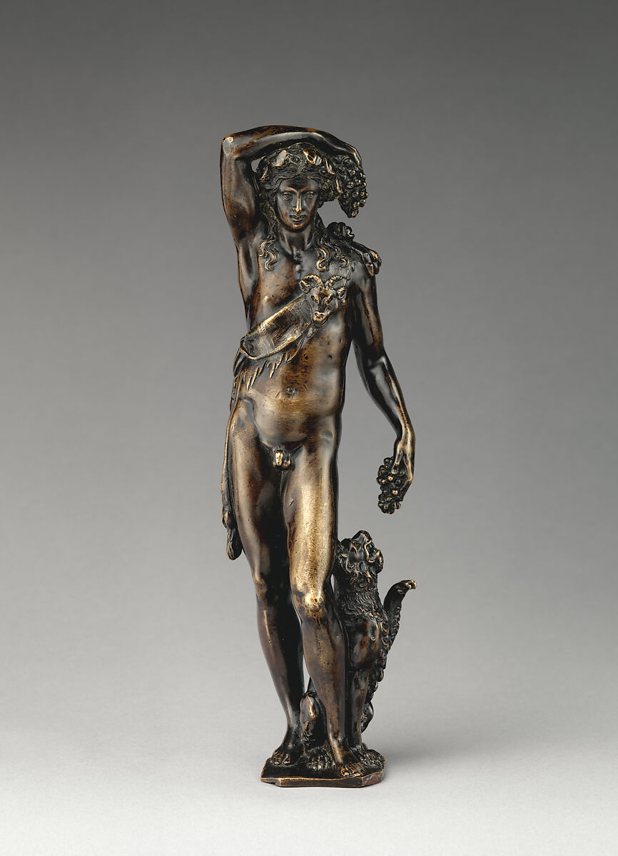 A large number of statuettes of this model exist, varying so much in their surface treatment that it is improbably that they were made at the same time and place. Some examples, such as another in the Metropolitan Museum (32.100.190), are less articulate than the Linsky Bacchus and have relatively matte surfaces, which might indicate Venetian workmanship. Attributions have ranged from the early-sixteenth-century Paduan goldsmith Francesco da Sant’Agata, to a Florentine under the influence of Benvenuto Cellini.[1] There is undoubtedly a Mannerist element in the svelte figure, but this is due largely to the ancient type that the artists were imitating. The classical precedent may have been a bronze statuette, since lost,[2] or a variation on a marble, such as one in Munich.[3]