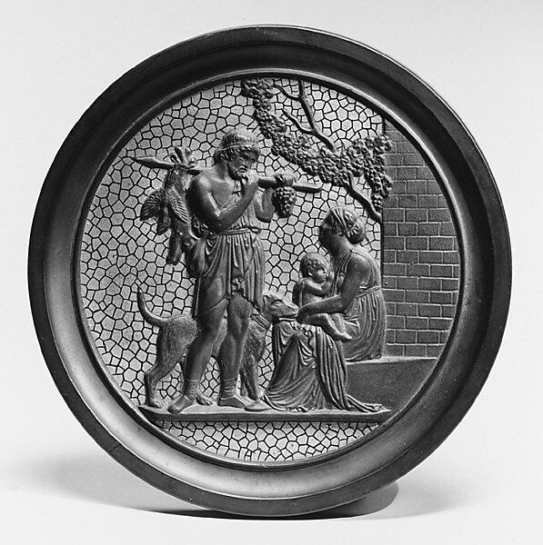 The subject is a wholly idealized and invented classical pastoral scene: a hunter and his dog return to his family at evening with a bird, a rabbit, and grapes, the results of his day of foraging. The pottery factory of P. Ipsen, run by his widow, was represented in the international exhibitions of 1876 and 1878 and had an agent in London and other cities.