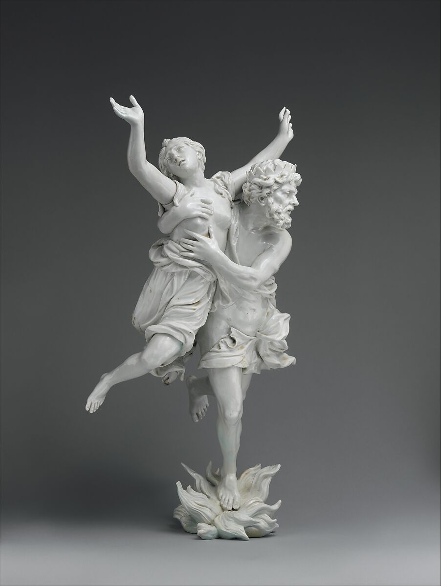 In the 1740s Carlo Ginori, the founder of the porcelain factory at Doccia, acquired a number of sculptural models in wax, terracotta, and plaster made by some of the leading Florentine baroque sculptors. The challenge and reward for the porcelain modelers at the Ginori factory was to overcome the technical difficulties of this fragile new medium and to retain the dynamism and balance of the original models. This group, based on a bronze by Foggini, depicts Pluto stepping into the flames as he carries the struggling Proserpina off to the underworld.