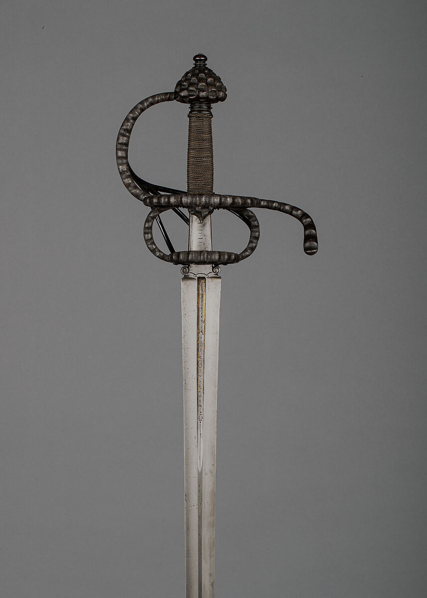 The rapier was the principal civilian sidearm throughout the sixteenth and seventeenth centuries. Designed for cut-and-thrust fencing of progressively complex techniques, the rapier is characterized by a double-edged blade with an acute point and an elaborate guard for the hand. The guards, usually of iron or steel, were subject to a variety of embellishment. They were engraved, chiseled, gilded, damascened, and encrusted in gold and silver in keeping with fashionable styles.