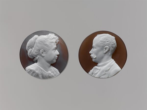 These twin cameos are said to be of Georges Tonnellier and his wife, but her endearingly homely profile and unmanageable hair do not match the image in a more glamorously sedate cameo inscribed as representing Mme Blanche Tonnellier (Walters Art Museum, Baltimore). The vaporous colorism, with bluish intonations, characterizes French fin-de-siècle cameos in general and Tonnellier’s in particular.