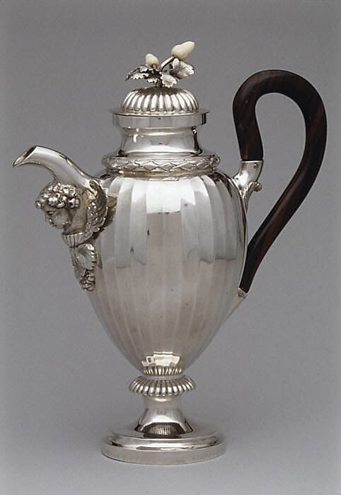 Early in the nineteenth century it became the custom to produce pots for coffee and hot milk en suite, and this piece was acquired together with its matching, smaller milk pot. Eschenlohr-who became a master silversmith in I824 has taken a simple Neoclassical form and enlivened it with a playful contrast of surface effects, decorative details, and materials. A cherub's head emerges from a cluster of grapes beneath the spout, the cover is topped by a trio of ivory acorns, and the dark smoothness of the handle complements the light-catching fluting of the body. Few