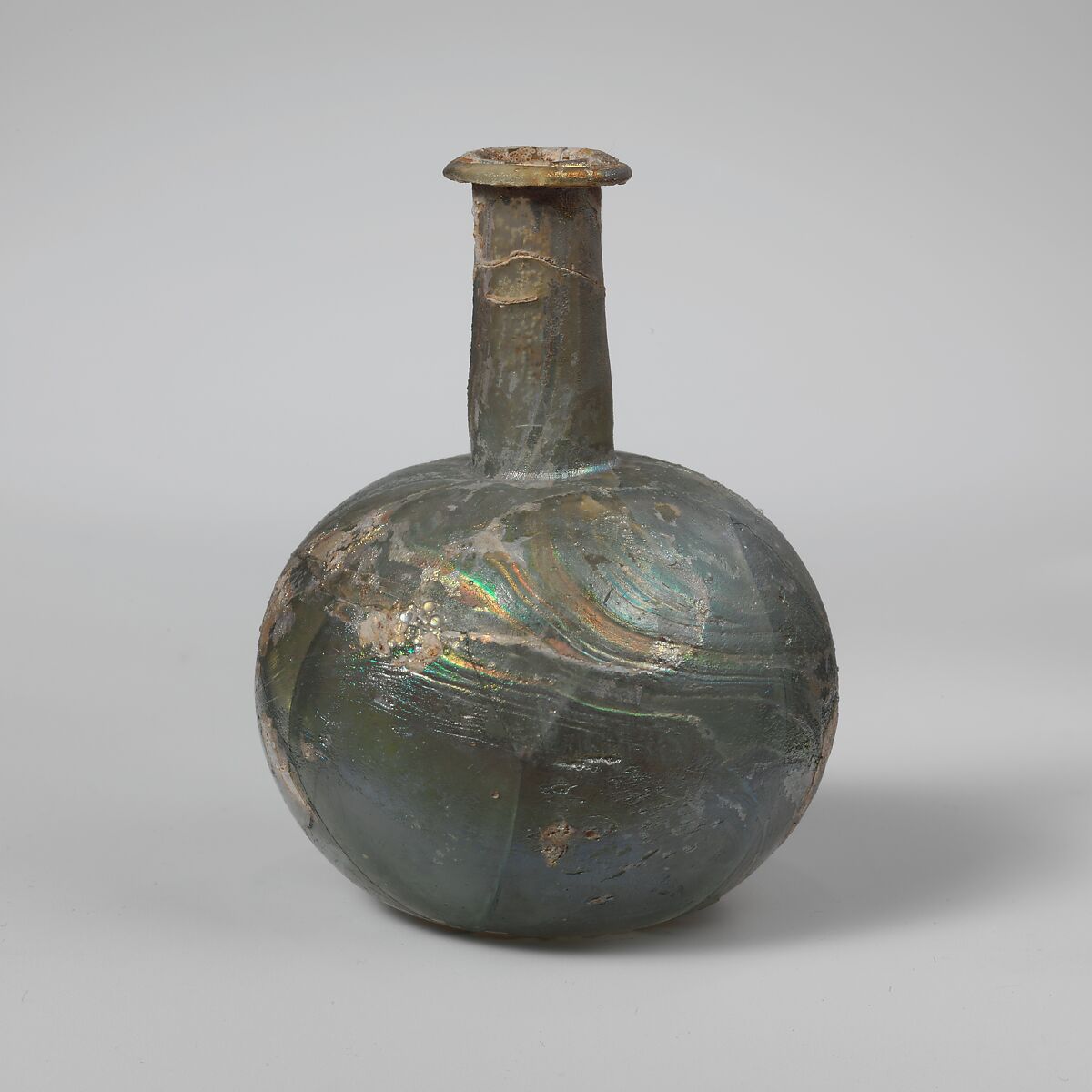 Rim folded out, down, over, and in; cylindrical neck, expanding slightly downwards and tooled in at base; globular body; slightly concvae bottom. Thick, heavy glass.