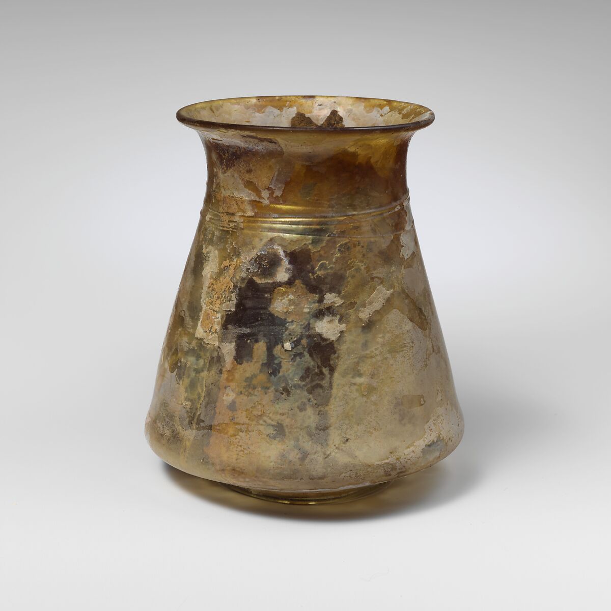 Plain, rounded rim; flaring neck; conical body, rounded at base; integral, tubular base ring; pushed-in bottom.