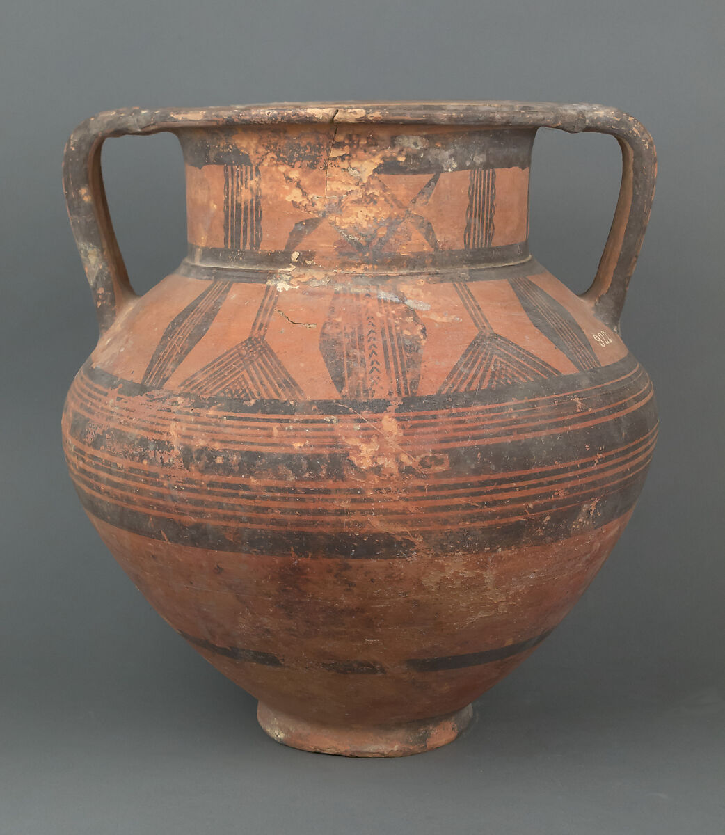 Amphora with multiple handles and geometric decoration.