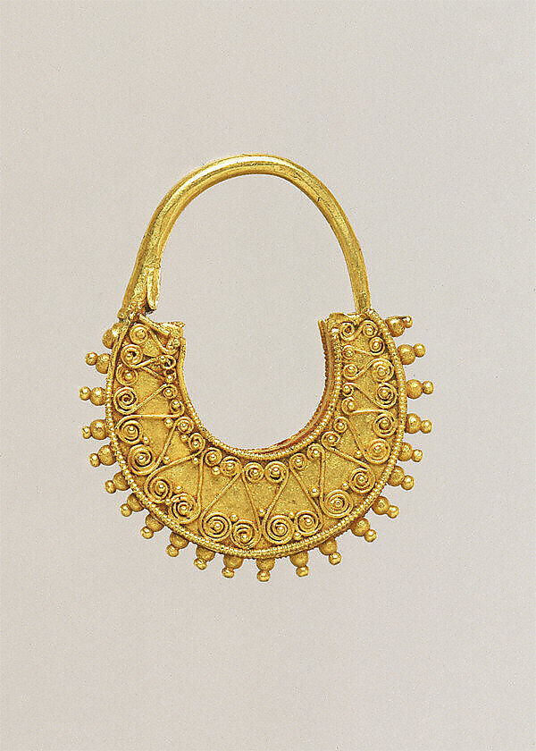 This shape of earring has a long tradition in the ancient Near East, stretching back to the Early Bronze Age.