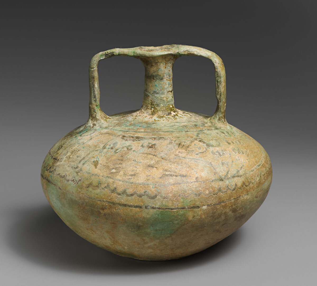 Faience was first imported to Cyprus from Egypt in the Late Bronze Age. Faience vases were also made locally in a style that reflected Egyptian, Levantine, and Aegean influence. The shape of this flask is Aegean, and the bull motif is similar to Egyptian representations. Most of the original painted decoration has worn off.